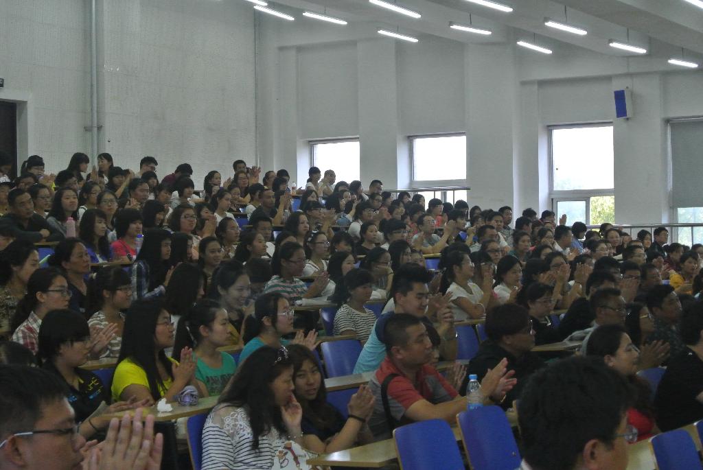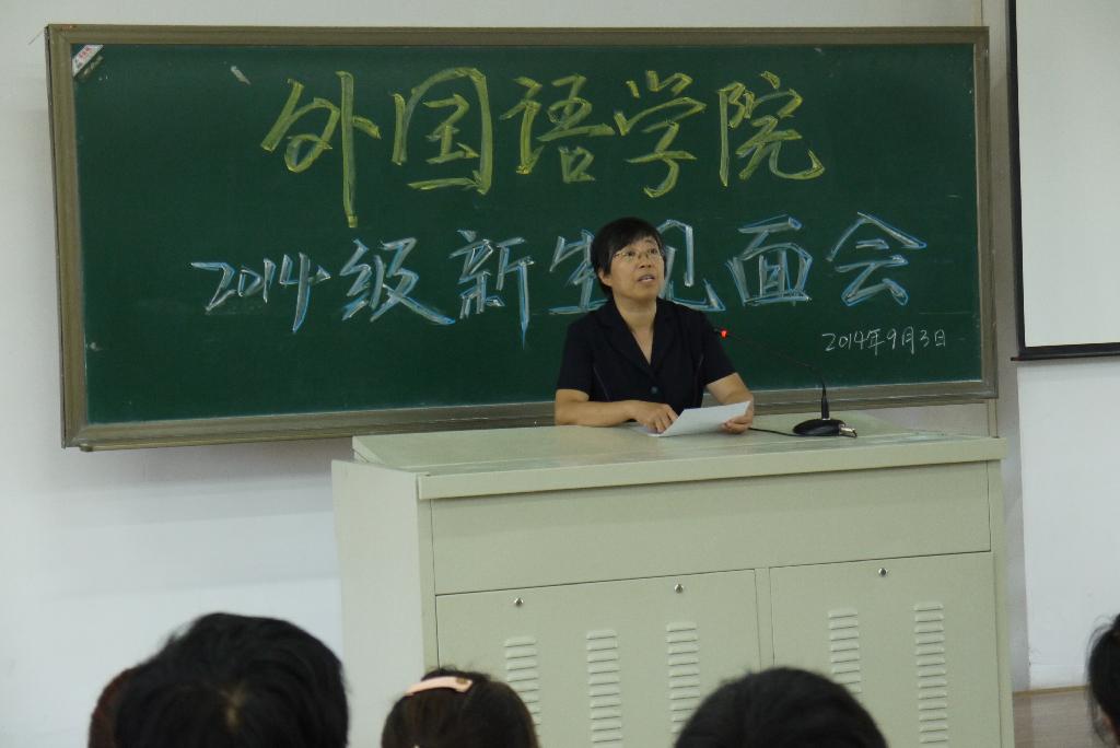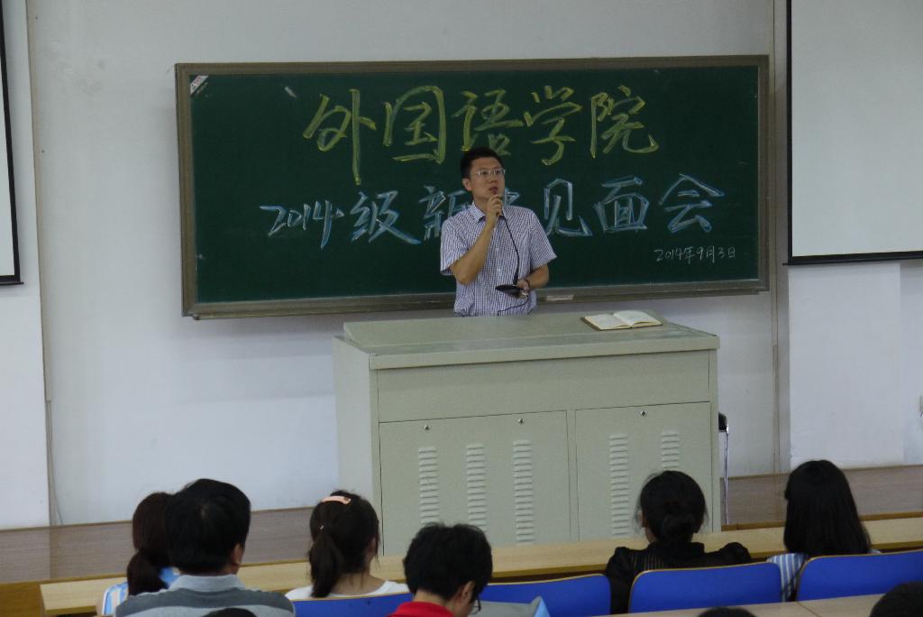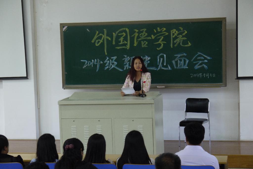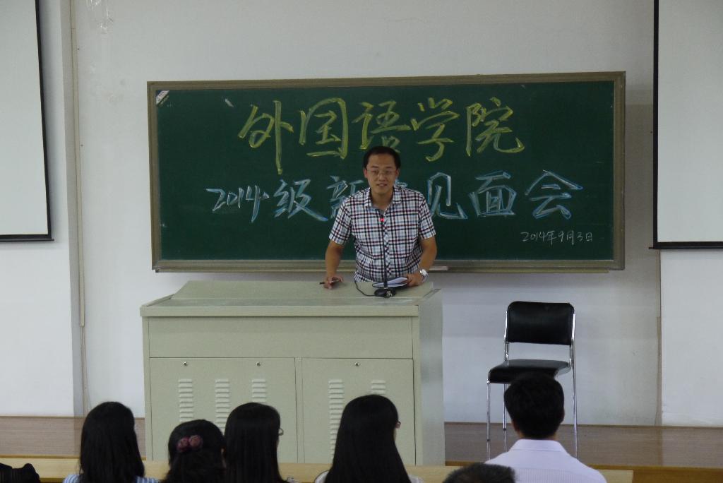 2014年9月3日下午,外国语学院2014级新生入学指导暨家长见面会在方圆楼201教室成功举行。外国语学院党委副书记兼副院长李海波、副院长卜育教授、团委书记赵跃、2013级学生辅导员王晗和2014级新生辅导员董清源出席了本次见面会,到会的学生和家长总数达到400人。