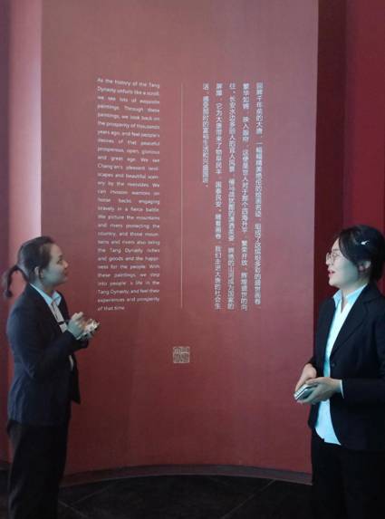 首先,大家参观了“又见大唐”的“盛世画卷”展厅。随着画卷,我们走进大唐的社会生活,感受那时的富裕生活和兴盛国运。透过展览,又见大唐盛世,感受大唐文明的文化基因,又见东方古国的延绵不息,太平盛世。随后大家来到“浩荡书风”展厅,姿态万千的笔划记录着国家兴盛、威德远播的全盛图景,字里行间反映出人们对世界的认知和信仰。在大家醉心于大唐盛景的同时,也不忘细心记录,讲解结束后,在外国语学院刘熠副院长与万平老师的指导下,同学们分成小组,讲解自己感兴趣的展品,并进行现场口译实践。体现出学院着力构建全程、全员、全方位的“课程思政”格局,贯彻落实培养语言功底扎实、人文与科学素养深厚,能够担当民族复兴大任的复合型英语专业人才的教学目标。