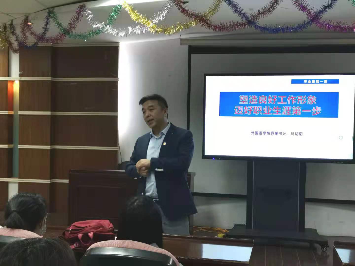 接下来,马明阳书记以“塑造良好工作形象,迈好职业生涯第一步”为主题向同学们讲授了进入社会前的最后一课。本次课程是对毕业生们未来的希冀,也为同学们步入工作岗位提供了切实又宝贵的建议。在思想层面,要有全局意识和服务意识,更重要的是具备良好的品德,有包容的心态;在行动方面,要发挥工作积极性与主动性,理性而有主见,耐心而有亲和力,脚踏实地,不怕吃亏。同时,要始终坚持廉洁自律,谦虚谨慎,锤炼更高的业务素质。全身心地投入工作,终将有所收获!课程尾声,马书记预祝全体毕业生同学们前程似锦!